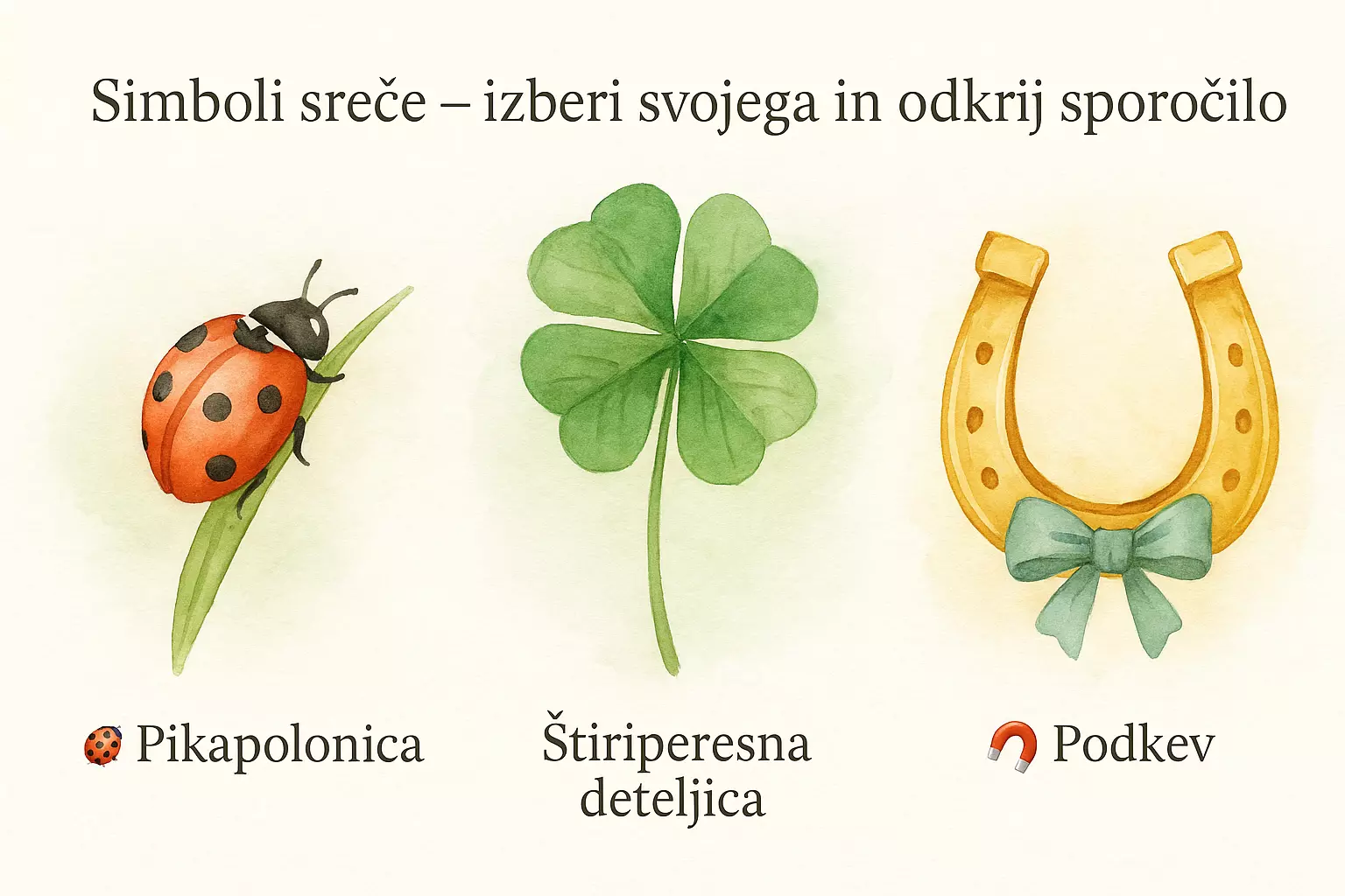Že od nekdaj ljudje v drobnih simbolih narave iščemo skrivno moč, navdih ali zaščito. Verjamemo, da nam srečni znaki na poti ponujajo upanje, kadar ga najbolj potrebujemo, in nas opominjajo, da je življenje polno majhnih čudežev, če le znamo gledati s srcem. Pikapolonica, štiriperesna deteljica in podkev niso le okraski – so opomnik, da lahko vsak dan prinese novo priložnost, iskrico veselja ali varno zavetje, ki ga začutimo v sebi.